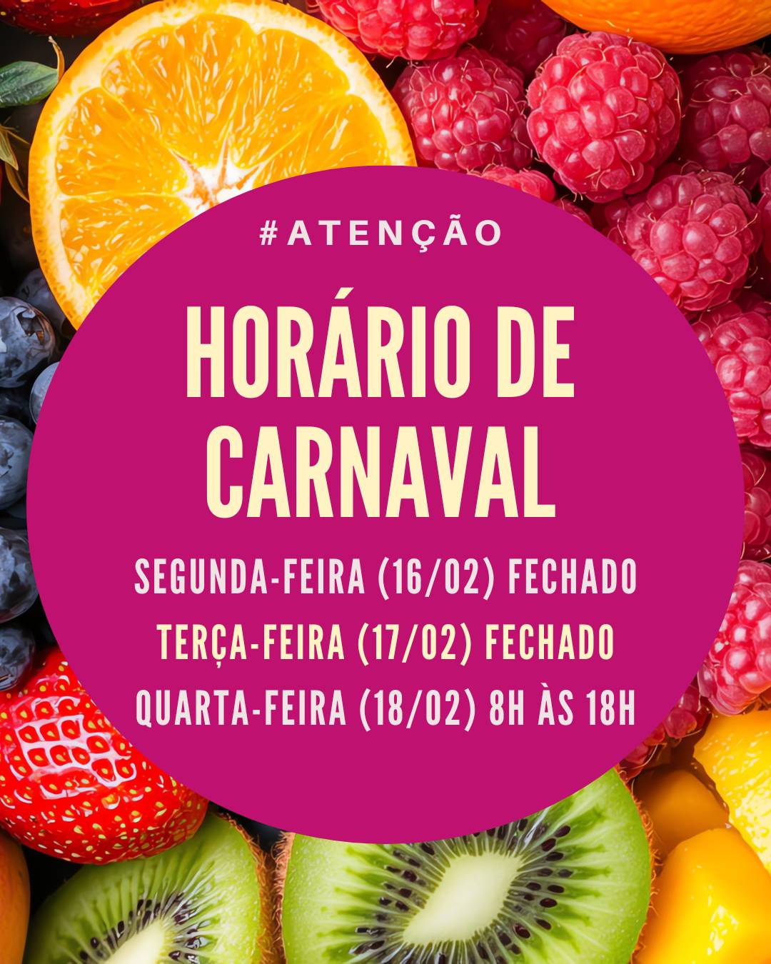 Nos dias 16 e 17 de fevereiro (segunda e terça-feira), o Mercado Municipal estará fechado.Voltamos a atender na quarta-feira (18/02) das 8h às 18h. Organize