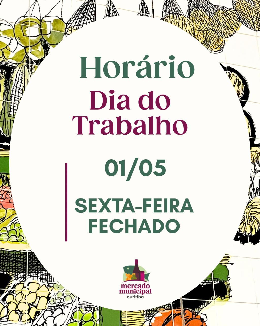 Na sexta-feira, dia 1º de maio (Dia do Trabalho), o Mercado Municipal de Curitiba estará fechado. No final de semana, o funcionamento segue normalmente:🗓️ Sábado: